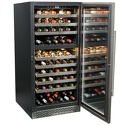 Тип: двухкамерный винный шкаф • Расположение: отдельностоящий • Цвет: чёрный • Размеры (ШxВxГ): 595x1270x710 мм • Количество дверей: однодверный • Общий объем: 267 л • Объем холодильной камеры: 267 л • Винный шкаф: 102 бут. • Управление: электронное • Освещение в холодильной камере: есть • Холодильная камера: полка для бутылок x 9 • Материал полок: дерево • Годовой расход энергии: 365 кВтч