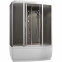 Закрытая кабина, полностенная, комбинированная с ванной, двери раздвижные, материал поддона: акрил, материал стенок: стекло, тропический душ, вертикальный гидромассаж, габариты (ШхВхД): 85x215x150 см