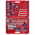 Комплектация– Головки торцевые и принадлежности 1/2"Головки торцевые стандартные 6-гранные – 8, 9, 10, 11, 12, 13, 14, 15, 16, 17, 18, 19, 21, 22, 24, 27, 30, 32 ммГоловки торцевые глубокие 6-гранные – 13, 14, 17, 19, 22 ммГоловки торцевые TORX Е-стандарт – E10, E12, E14, E16, E18, E20, E22, E24Головки свечные 12-гранные – 14, 16 ммУдлинители стандартные – 125, 250 ммТрещотка флажковая с кнопкой – 45 зубцов, длина 250 ммВороток с шарниром – 450 ммКардан – 1 шт.Переходник с отверстием для воротка – 3/8" х 1/2"Переходник адаптер для вставок (бит) – F1/2">F5/16" (8 мм)Ключ динамометрический – диапазон усилий: от 42 до 210 Нм– Головки торцевые и принадлежности 1/4"Головки торцевые стандартные 6-гранные – 4, 4.5, 5, 5.5, 6, 7, 8, 9, 10, 11, 12, 13 ммГоловки торцевые глубокие 6-гранные – 8, 10, 11, 12, 13 ммГоловки торцевые TORX Е-стандарт – E4, E5, E6, E7, E8Удлинители стандартные – 75, 100 ммТрещотка флажковая с кнопкой – 45 зубцов, длина 125 ммВороток скользящий Т-образный – 115 ммКардан – 1 шт.Отвертка-вороток – 150 мм– Насадки торцевые 1/4" (6.35 мм)Крестовые Phillips – PH1, PH2Крестовые Pozidrive – PZ1, PZ2Шлицевые Slotted – 5.5, 7 ммTORX – T8, T10, T15, T20, T25, T27, T30Шестигранные – H3, H4, H5, H6, H7– Вставки (биты) 5/16" (8 мм)Крестовые Phillips – PH3, PH4Крестовые Pozidrive – PZ3, PZ4Шлицевые Slotted – 8, 10, 12 ммTORX – T40, T45, T50, T55, T60Шестигранники – Н3, Н4 ,H5, H6, H7SPLINE – M6, M8, M10, M12– КлючиКлючи комбинированные – 6, 7, 8, 9, 10, 11, 12, 13, 14, 15, 16, 17, 18, 19, 21, 22, 24 мм– ОтверткиКрестовые Phillips – №1 х 75 мм, №2 х 100 мм, №3 х 150 ммШлицевые Slotted – 5.5 х 75 мм, 6.5 х 100 мм, 8.0 х 150 мм– Шарнирно-губцевый инструментПлоскогубцы комбинированные – длина 175 ммБокорезы стандартные – длина 150 ммЗахват переставной – длина 250 мм– Прочий инструментНабор шестигранников – 1.5, 2, 2.5, 3, 4, 5, 6, 8, 10 ммМолоток – 500 грМагнит телескопический – 1 шт.Индикатор напряжения – 6-24 В