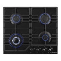 Поверхность: варочная панель • Тип поверхности: газовая • Рабочая поверхность: закаленное стекло • Число конфорок: 4 • Установка: независимая • Газовые конфорки: всего - 4 (1 конфорка "Тройная корона") • Газ-контроль конфорок: есть • Тип управления: механическое • Переключатели: поворотные • Электроподжиг: есть, автоматический • Размеры: 590x515x51 мм • Размер ниши для встраивания: 560x485 мм