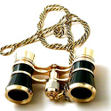 Театральный бинокль с витой цепочкой. Обладает 3-кратным увеличением и 25-миллиметровыми объективами. Корпус бинокля выполнен в элегантном дизайне черного цвета с золотистыми элементами.