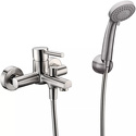 Назначение: универсальный • Конструкция: однорычажный • Монтаж: вертикальный • Клапан: керамический • Материал: латунь, покрытие - хром • Подводка: жесткая • Монтажные отверстия: 2 отверстия • Форма излива: традиционная • Душевая лейка в комплекте: есть • Держатель для душевой лейки: настенный держатель • Донный клапан в комплекте: есть