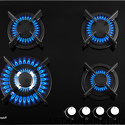 Поверхность: варочная панель • Тип поверхности: газовая • Рабочая поверхность: закаленное стекло • Число конфорок: 4 • Установка: независимая • Газовые конфорки: всего - 4 (1 конфорка "Тройная корона") • Газ-контроль конфорок: есть • Тип управления: механическое • Переключатели: поворотные • Электроподжиг: есть, автоматический • Размеры: 600x510x40 мм • Размер ниши для встраивания: 560x490 мм
